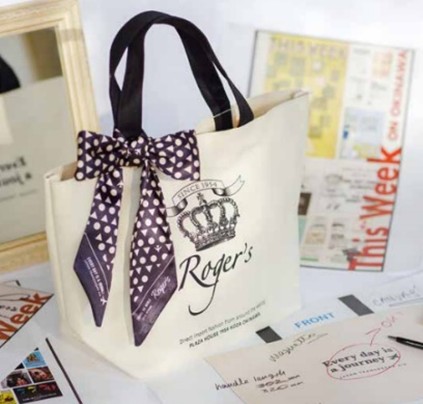 バイヤーとして日頃より店舗へ足を運んでいる私もその魅力の虜になった一人だが、このオリジナルバッグを見るたび、「日本トランスオーシャン航空(以下:JTA)限定トートバッグを作りたい!」と強く願っていた。今年に入り勇気をもってお声がけしたところ、JTAとプラザハウスの両社に『旅』という共通のコンセプトがあったおかげで、ロージャースとしては初の企業コラボでありながら、すぐに制作に賛同を得ることができた。